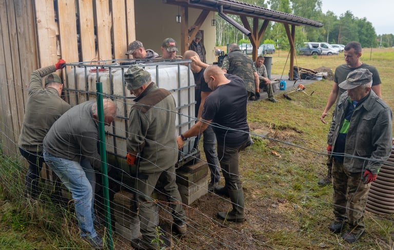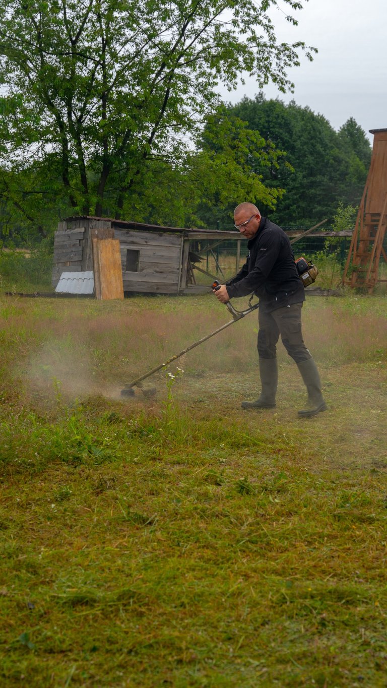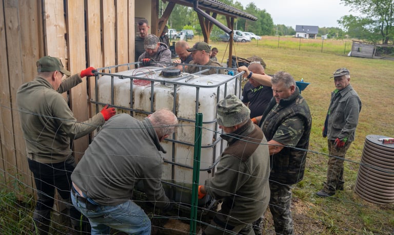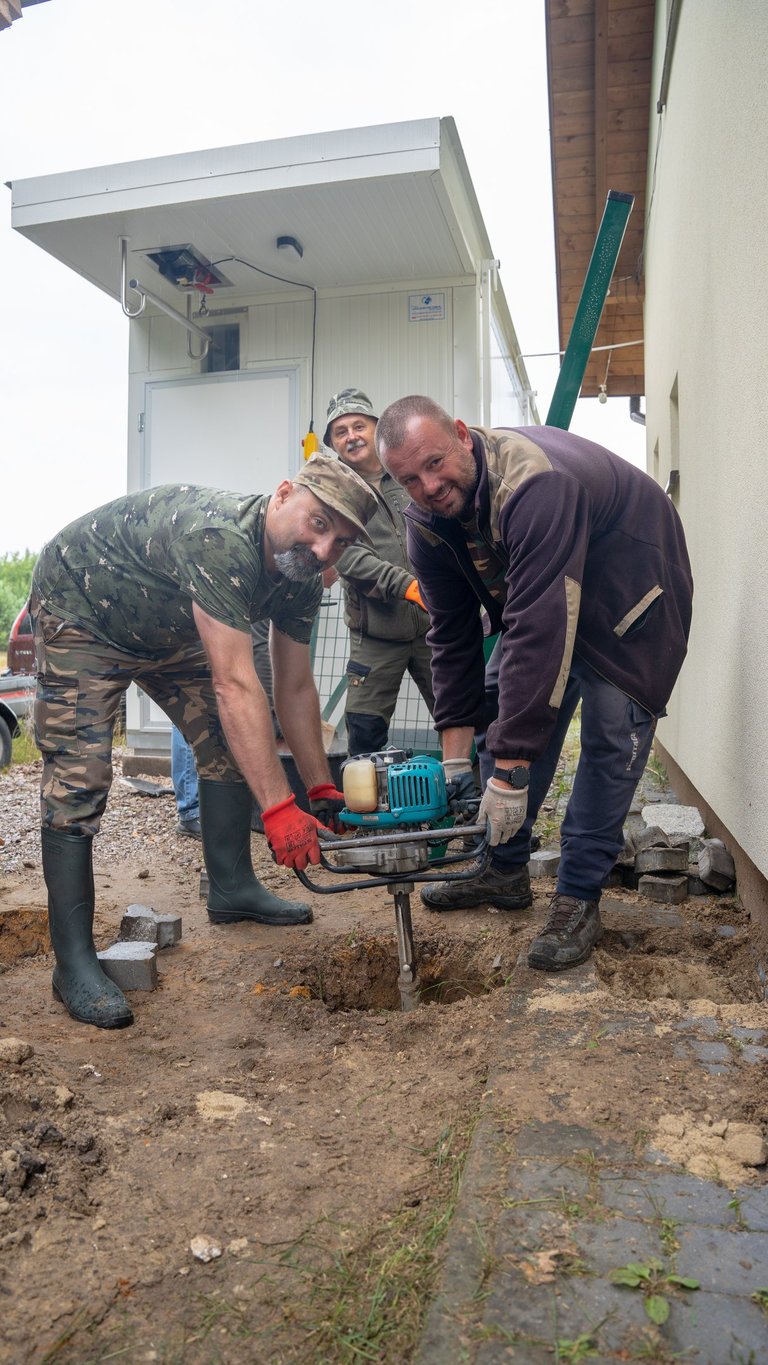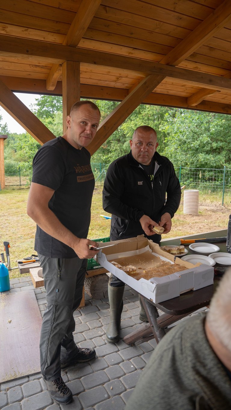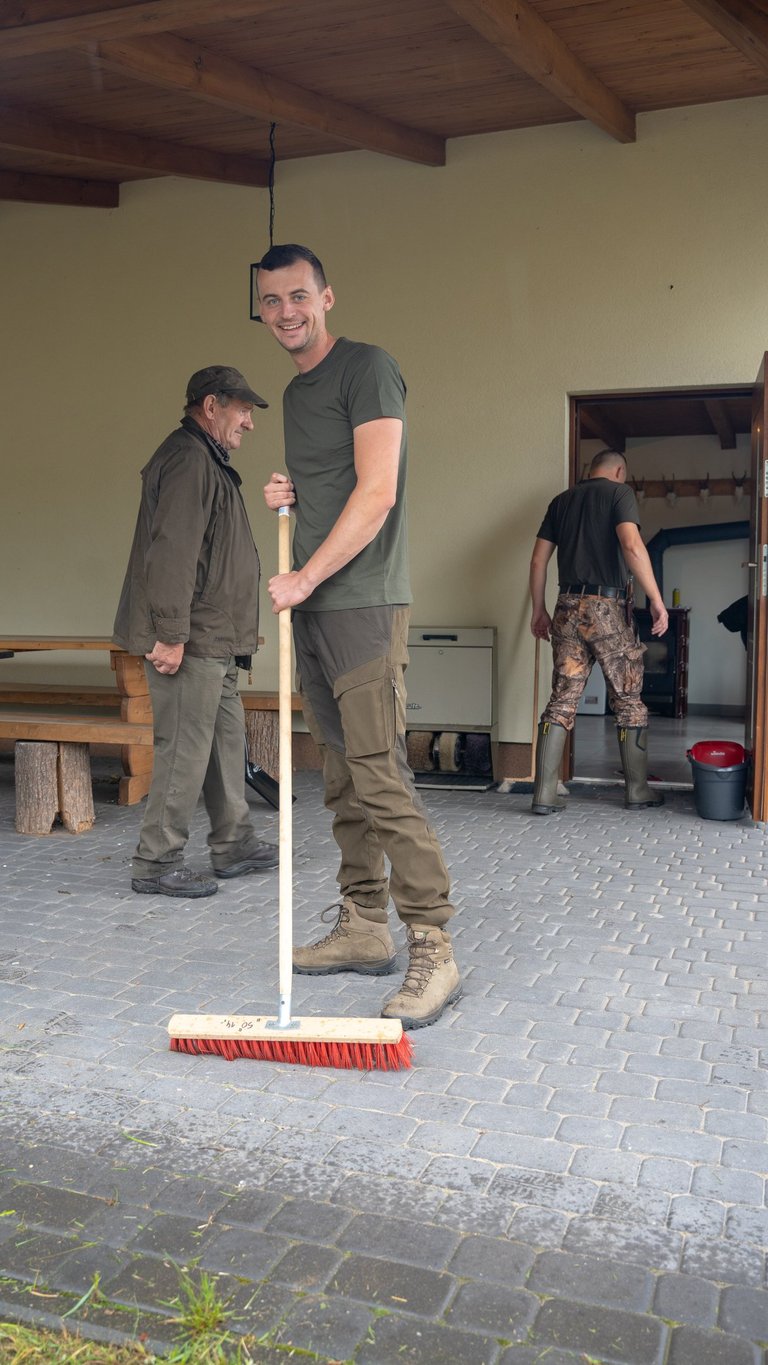 Wspólnym wysiłkiem uporządkowaliśmy teren wokół domku myśliwskiego, przeprowadziliśmy zalewanie słupków pod przyszłe ogrodzenie chłodni, wykosiliśmy trawę, a także pocięliśmy drewno i starannie ułożyliśmy je w drewutni. Zadbaliśmy również o czystość wewnątrz osady myśliwskiej oraz wokół niej, a przy okazji wykonano niezbędne prace konserwacyjne przy urządzeniach łowieckich – ambonach i paśnikach.