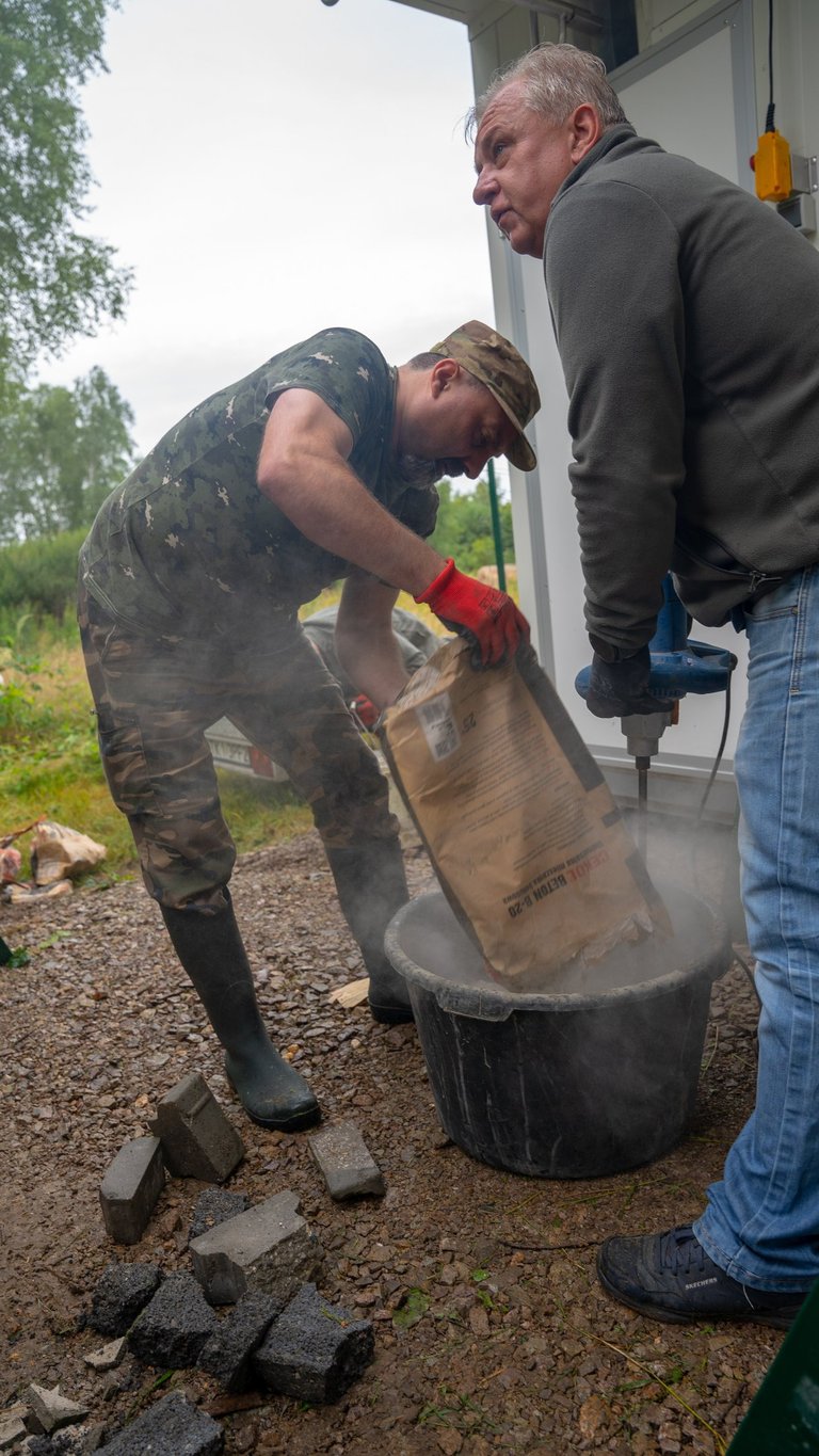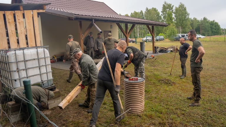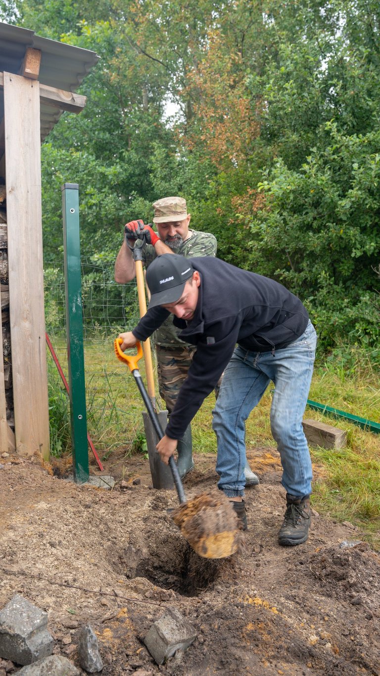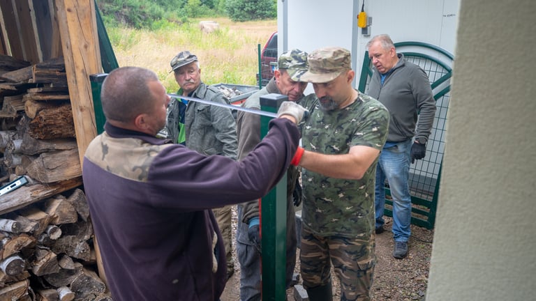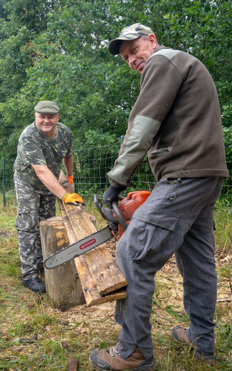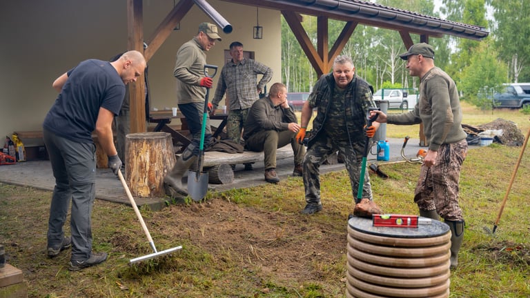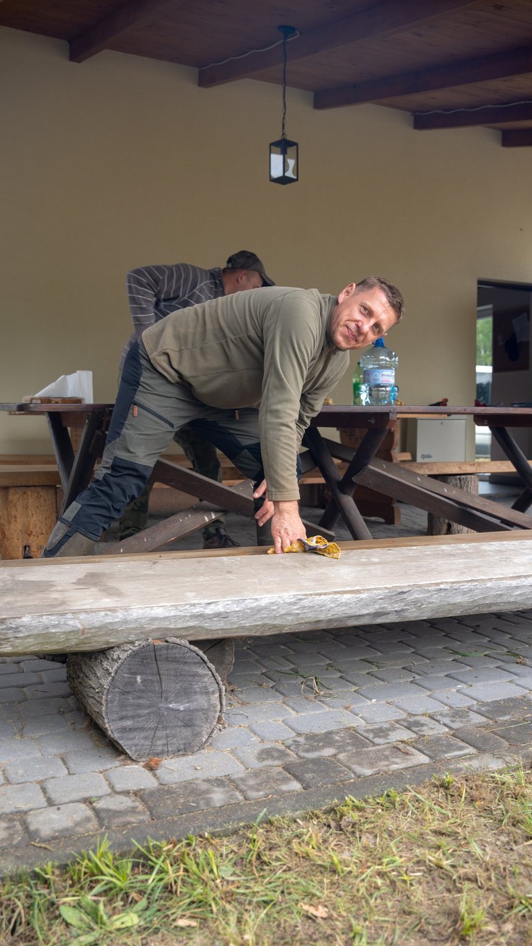 Wspólnym wysiłkiem uporządkowaliśmy teren wokół domku myśliwskiego, przeprowadziliśmy zalewanie słupków pod przyszłe ogrodzenie chłodni, wykosiliśmy trawę, a także pocięliśmy drewno i starannie ułożyliśmy je w drewutni. Zadbaliśmy również o czystość wewnątrz osady myśliwskiej oraz wokół niej, a przy okazji wykonano niezbędne prace konserwacyjne przy urządzeniach łowieckich – ambonach i paśnikach.