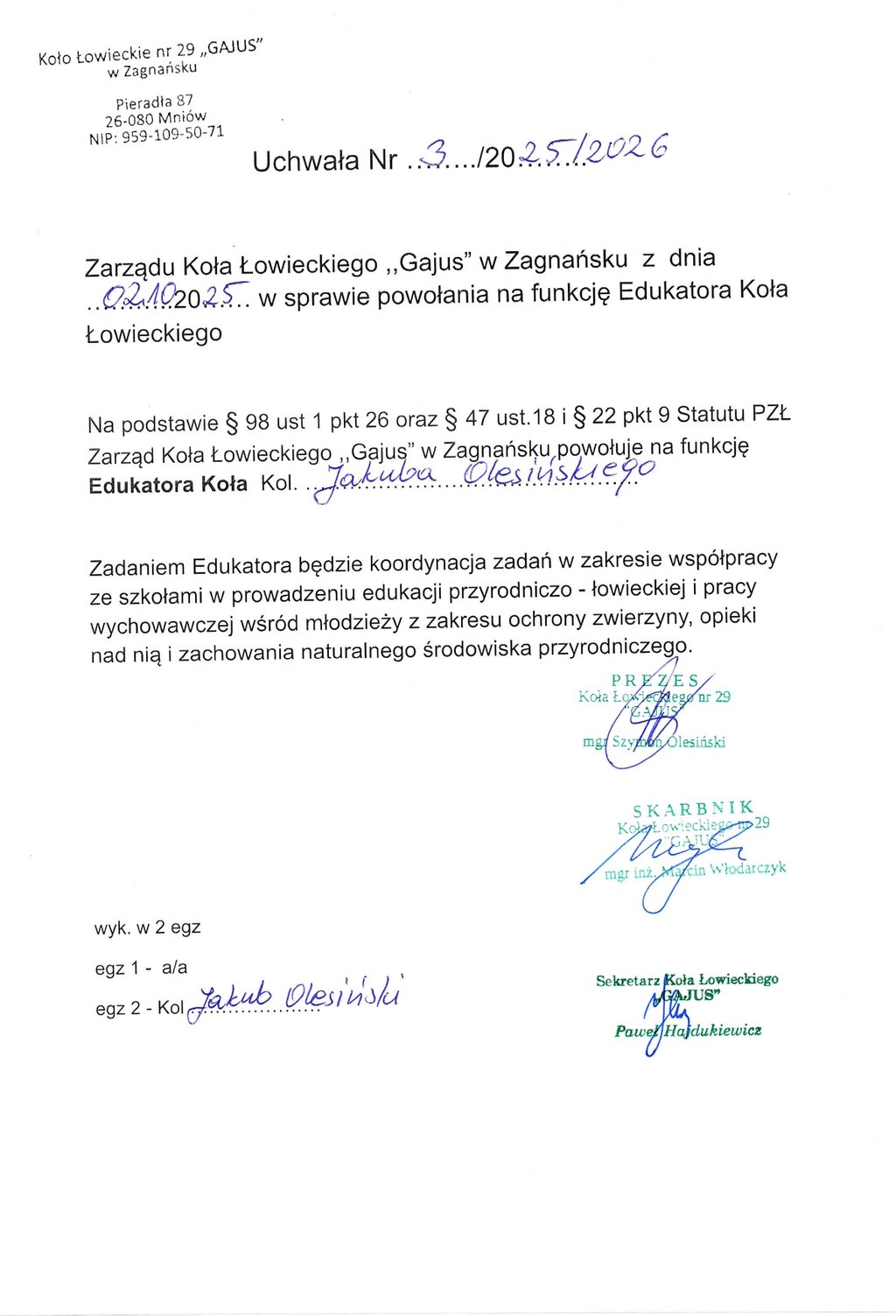 Zgodnie z zaleceniem Zarządu Głównego Polskiego Związku Łowieckiego, mającym na celu rozwój działalności edukacyjnej i promocję etyki łowieckiej, informujemy, że decyzją Zarządu Koła Łowieckiego „Gajus” kolega Jakub Olesiński został powołany na funkcję Edukatora naszego Koła.