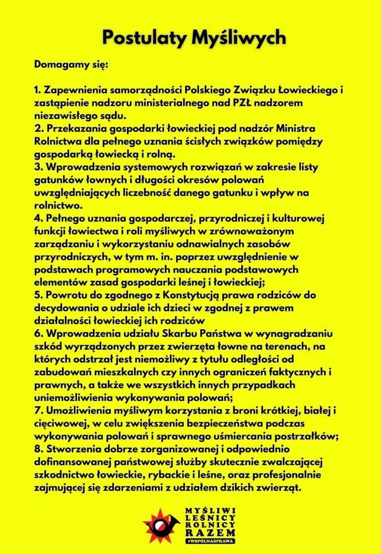 W stolicy nasze Koło reprezentowali Tomasz Boruń, Paweł Hajdukiewicz, Szymon Olesiński oraz Andrzej Tokarczyk. Głównymi postulatami podczas tego protestu były: apel o uwzględnienie wiedzy i doświadczenia myśliwych w tworzeniu prawa łowieckiego, ochrona praw własności oraz dostęp do terenów łowieckich, a także sprzeciw wobec nieuzasadnionych ograniczeń w polowaniach redukcyjnych, które są niezbędne dla zachowania równowagi ekologicznej.
