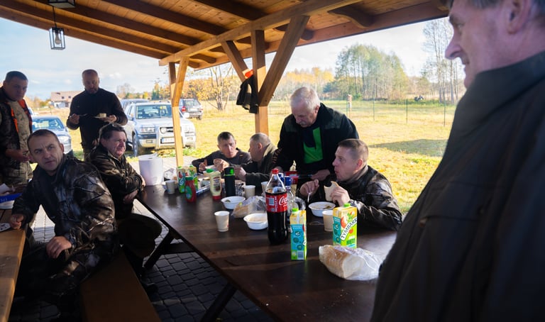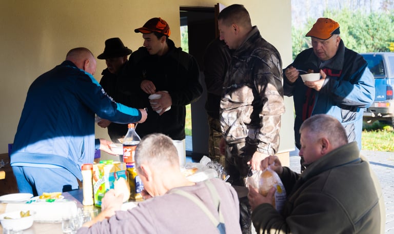 Po intensywnym polowaniu, wszyscy uczestnicy zgromadzili się na zasłużonym posiłku. Dzięki zaangażowaniu ks. kan. Zbigniewa Krzyszkowskiego, Szymona Olesińskiego oraz Czesława Kowalskiego, mogliśmy delektować się wyśmienitymi potrawami, które umocniły nasze braterstwo łowieckie.