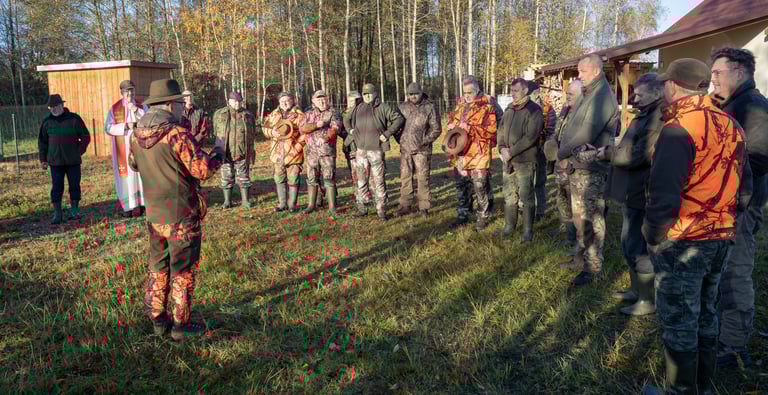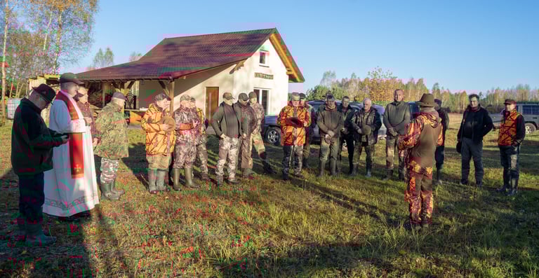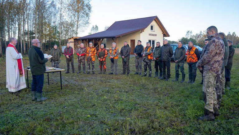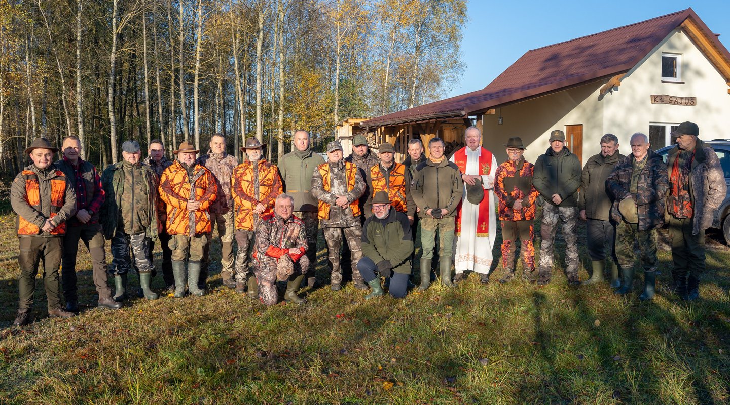 Szanowni Koledzy, W dniu 25 października 2025 roku odbyło się uroczyste rozpoczęcie sezonu łowieckiego naszego Koła Łowieckiego „Gajus”, połączone z Mszą Świętą Hubertowską. Uroczystość celebrował nasz kolega myśliwy – Ksiądz Dziekan Zbigniew Krzyszkowski, który w piękny i podniosły sposób poprowadził nabożeństwo w intencji myśliwych, ich rodzin oraz wszystkich, którzy odeszli już do Krainy Wiecznych Łowów. Podczas Mszy Świętej ksiądz Zbigniew Krzyszkowski dokonał również poświęcenia naszej osady myśliwskiej, a także przekazał Kołu wyjątkowy dar – krzyż oraz ryngraf z wizerunkiem św. Huberta, będący symbolem opieki patrona myśliwych nad naszym środowiskiem. Dar ten stanowi piękne i trwałe świadectwo więzi duchowej oraz szacunku wobec tradycji łowieckiej. Choć w tym roku polowanie Hubertowskie nie mogło się odbyć z przyczyn formalnych – wynikających z nieterminowego zgłoszenia harmonogramu polowań do gmin i nadleśnictw – uroczystość miała niezwykle doniosły i wspólnotowy charakter. Spotkanie to pozwoliło nam zjednoczyć się w duchu św. Huberta, odnowić więzi koleżeńskie oraz wspólnie rozpocząć nowy sezon łowiecki z należytym szacunkiem dla tradycji i etyki łowieckiej. Po zakończonej Mszy Świętej na uczestników czekał poczęstunek przygotowany przez prowadzących polowanie – Prezesa Szymona Olesińskiego, księdza Zbigniewa Krzyszkowskiego, kol. Czesława Kowalskiego oraz kol. Jakuba Olesińskiego. Serwowano pyszny gulasz z dziczyzny oraz domowe ciasta, które cieszyły się dużym uznaniem wśród wszystkich obecnych. Była to doskonała okazja do rozmów, wspomnień i wspólnego świętowania w serdecznej atmosferze. Darz Bór Szymon Olesiński
